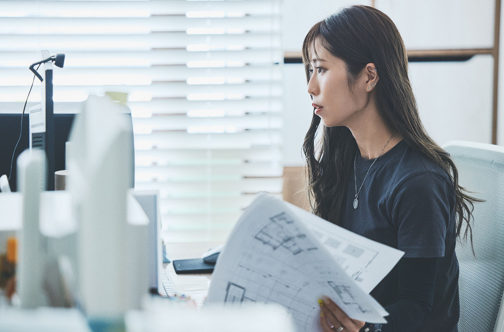 もともと内装業の現場監督をしていて、その仕事の空いている期間にアルバイトとして働き始めたのが、インテリアニシダに入社するきっかけでした。最初は施工も現場管理も、両方するということに驚きました。以前の職場では、現場監督は自らが動いてはいけなかったので。それが楽しくて、自分に合っていると思って入社を決めたんです。現在は、担当現場の材料の取りまとめや人員手配などの準備から、施工現場の管理業務、請求書作成まで一連の業務を担っています。同時に、今年入社した新入社員の教育にも力を入れているんです。待望の女性社員なので、同じ女性として、今まで自分が感じたことや気づいたことを伝えるようにしています。ただ、私は現場に出るとどうしても口調が強くなってしまうようで(苦笑)。後輩に接する時は、萎縮させないよう言葉遣いに気をつけています!
